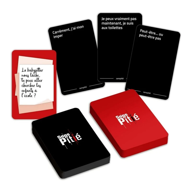 Soyez sans pitié avec ce jeu de cartes réalisé par les créateurs de Juduku et Blanc-manger Coco ! Le ton des cartes est volontairement décalé pour vous faire passer de bons moments sous le signe de l’humour noir ! Le but du jeu ? Répondre à un simple texto de manière totalement débridée ! Le maître du jeu pioche une carte rouge et lit à voix haute son contenu. Chacun des joueurs devra alors choisir parmi ses 12 cartes noires laquelle complétera le mieux la carte rouge. Le maître du jeu choisira ensuite qui deviendra le prochain maître du jeu grâce à sa réponse la plus en accord… Et surtout la plus incongrue !