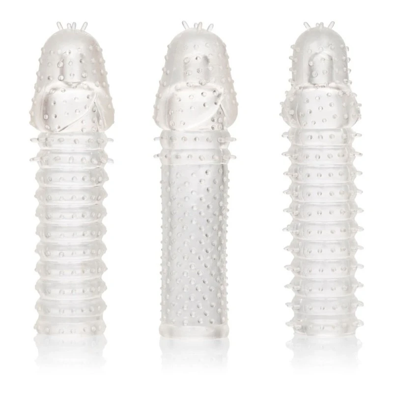 Le Kit Gaines à Pénis Extension de CalExotics comprend 3 gaines texturées à l’intérieur et à l’extérieur pour stimuler votre partenaire et vous simultanément !