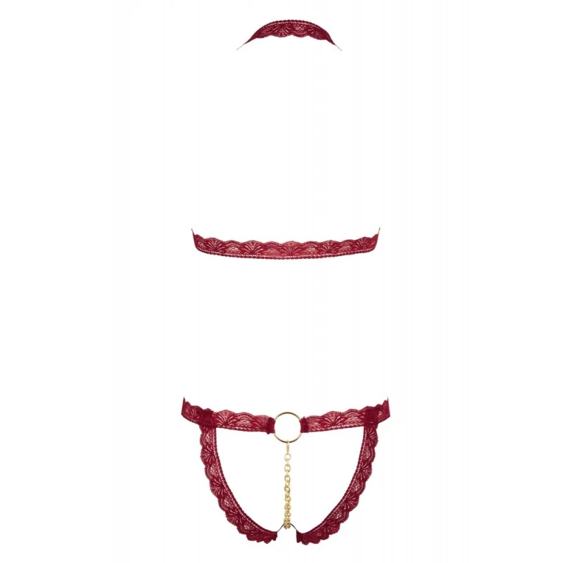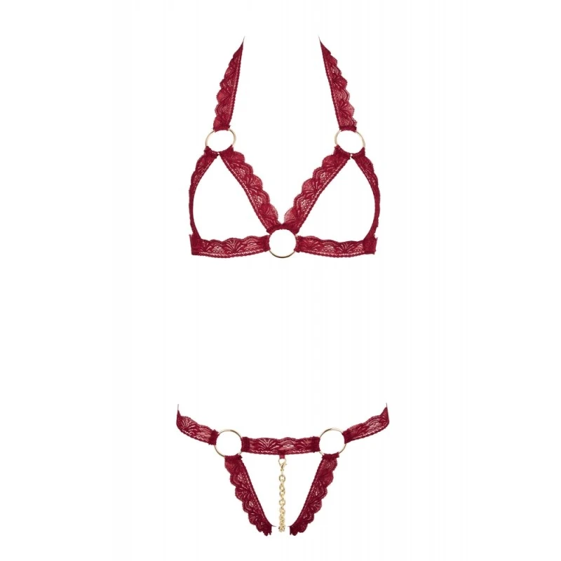 Adoptez cet ensemble composé d’un soutien-gorge triangle totalement ouvert au niveau des seins pour une mise en valeur de la poitrine. Des lanières viendront encadrer et remonter la poitrine pour un rendu sexy et irrésistible ! Le string assorti est également ouvert à l’entrejambe pour un effet très érotique. Il est orné d’une chaîne dorée pour décorer vos parties intimes qui viendra également les stimuler en frottant votre clitoris… L’ensemble est en dentelle fine de couleur bordeaux pour un effet chic et des petits anneaux viennent décorer l’ensemble de cette pièce de lingerie pour un rendu ultra-sexy !