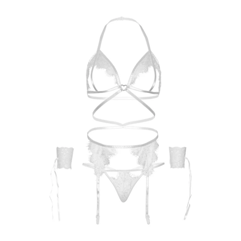 Découvrez l’Ensemble 4 Pièces Ouvert 81653 Dentelle Blanche & Menottes de Leg Avenue ! Une lingerie d’un blanc immaculé composée d’un soutien-gorge, d’un porte-jarretelles, d’un string et d’une paire de menottes !
