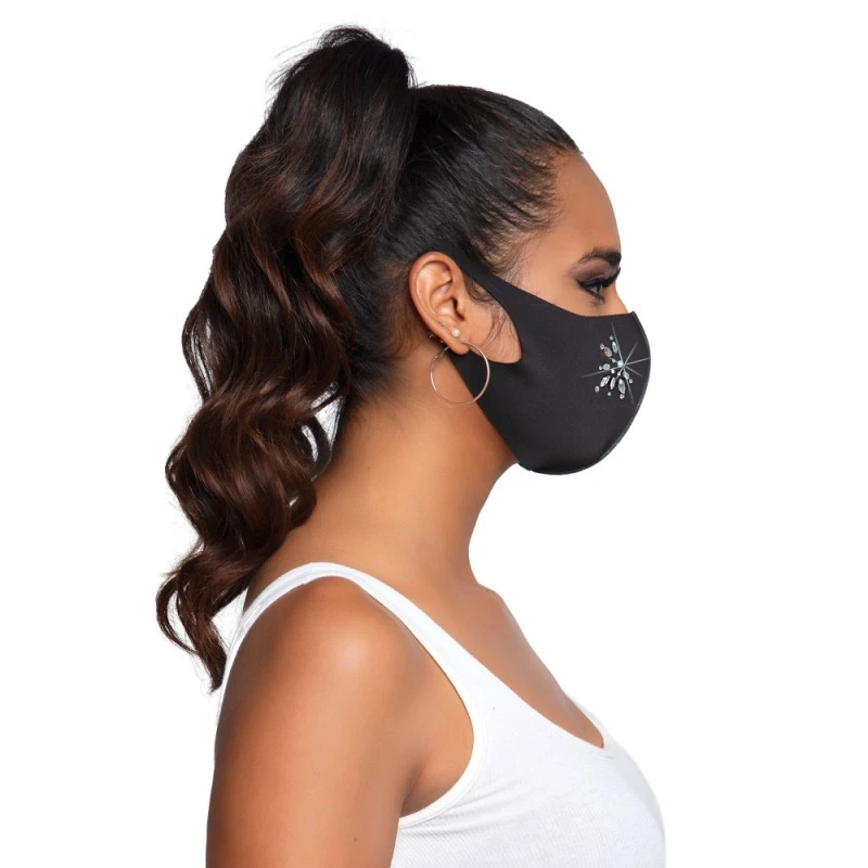 Réutilisable, ce masque en tissu doux se positionnera sur votre visage en toute sobriété avec vous protégera tout au long de la journée. Entièrement noir, ce masque possède de jolis motifs floraux en strass avec différentes couleurs qui apporteront une touche stylée !