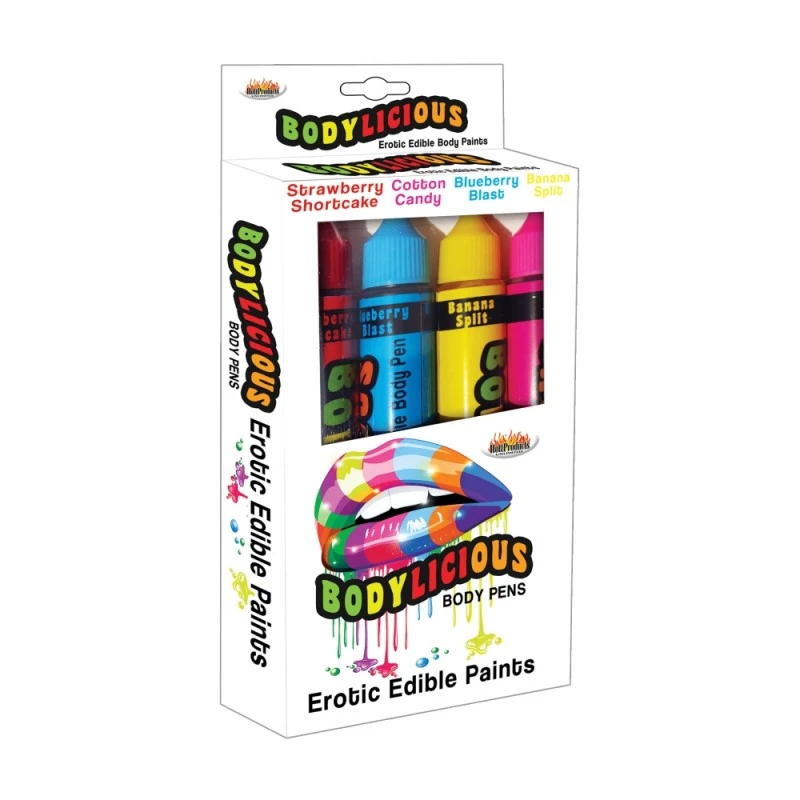 La boîte contient 4 feutres composés d’une peinture 100% comestible que vous pouvez utiliser lors de vos moments intimes avec votre partenaire. Laissez libre court à votre imagination, le corps de votre partenaire en sera ravi ! Cette peinture comestible invite à la gourmandise : ses 4 parfums Tartelettes aux Fraises, Barbe à Papa, Explosion de Myrtilles et Banana Split éveilleront vos sens pour une excitation au maximum ! Ne résistez pas à la tentation, dessinez, régalez-vous et passez des moments érotiques très délicieux ensemble avec ces feutres Bodylicious Body Pens !