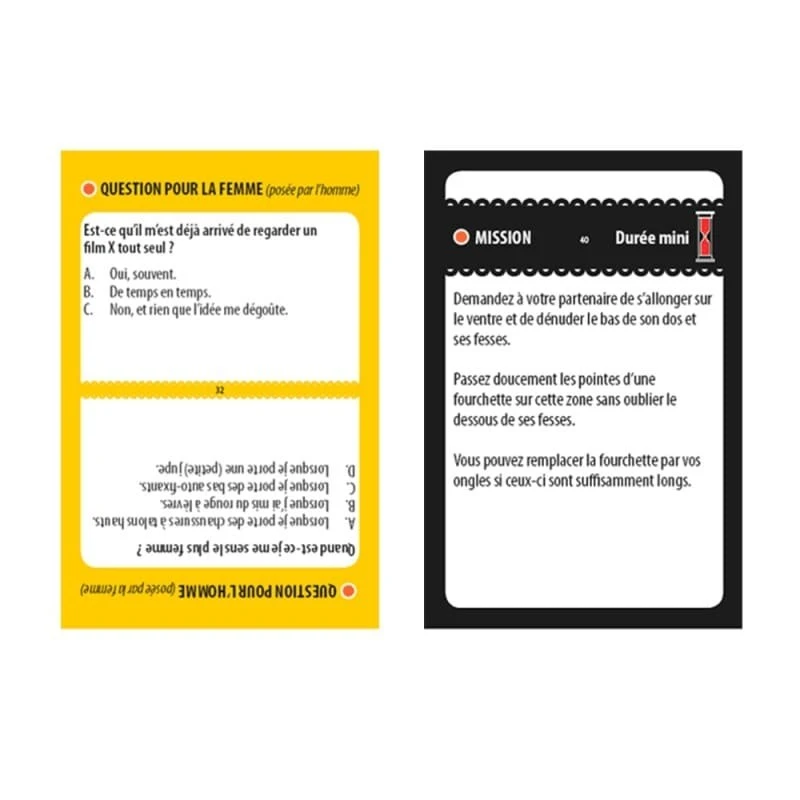 Dans le jeu mission intime, il n’y a rien d’obligatoire et toutes les missions peuvent être accomplies comme bon vous semble. Mission Intime a été développé en coopération avec des sexologues. C’est un jeu coquin excitant, qui ne porte pas atteinte à la femme et dans lequel les partenaires se respectent.