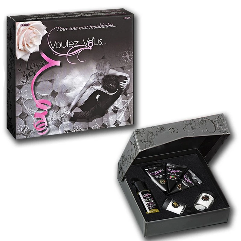 Vivez d’une nuit de noces des plus coquines avec le Coffret de Massage Coquin Mariage de Voulez-Vous… Il contient 6 produits de massages qui vous permettront de rendre votre nuit inoubliable !